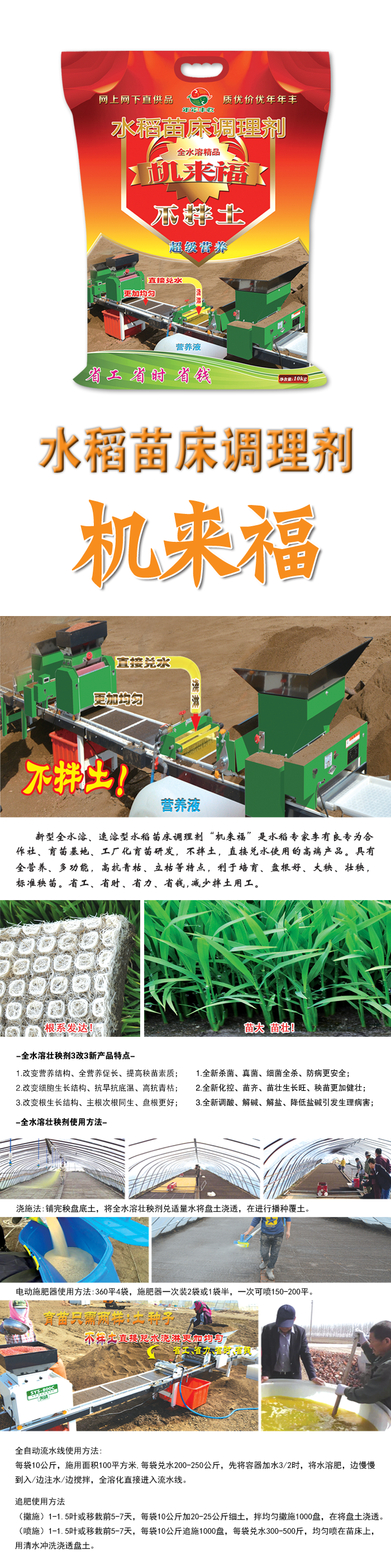 新型全水溶、速溶型水稻苗床調(diào)理劑“機(jī)來?!笔撬緦<依钣辛紝楹献魃?、育苗基地、工廠化育苗、機(jī)插秧育苗研發(fā),不拌土,直接兌水使用的高端產(chǎn)品。具有全營(yíng)養(yǎng)、多功能,高抗青枯、立枯等特點(diǎn),利于培育、大秧、壯秧、盤根好,標(biāo)準(zhǔn)秧苗省工、省時(shí)、省力、省錢,減少拌土用工,降低育苗成本,使用更加方便。