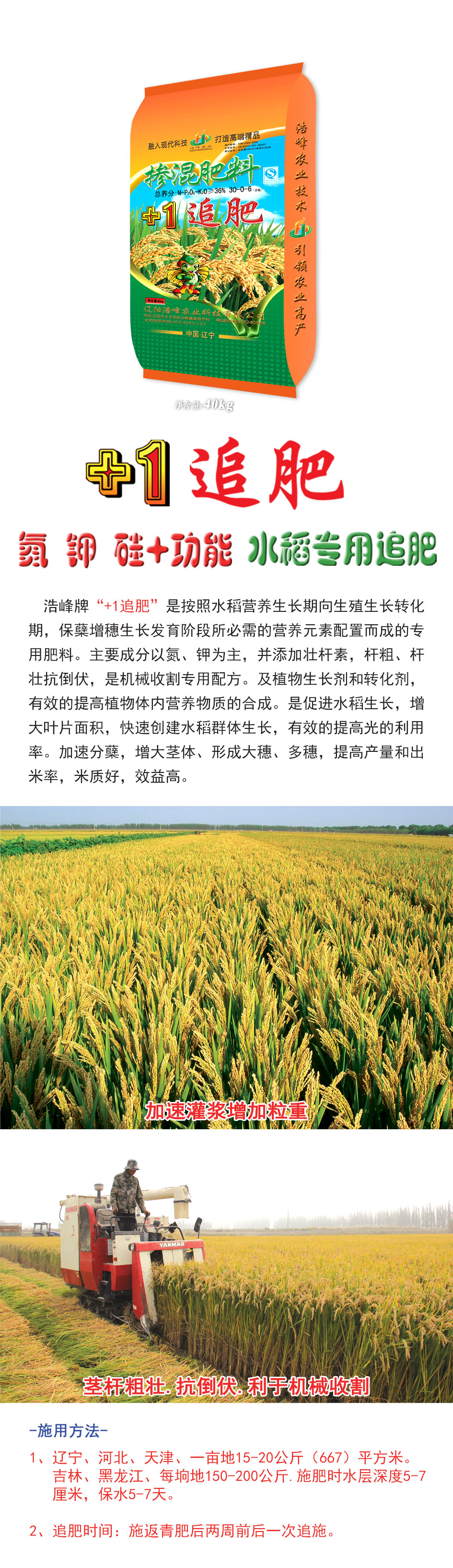 浩峰牌“+1追肥”是按照水稻營養(yǎng)生長期向生殖生長轉化期,保蘗增穗生長發(fā)育階段所必需的營養(yǎng)元素配置而成的專用肥料。主要成分以氮、鉀為主,并添加壯桿素,桿粗、桿壯抗倒伏,是機械收割專用配方。及植物生長劑和轉化劑,有效的提高植物體內營養(yǎng)物質ず銑傘J譴俳舊?,札e笠鍍婊?,繝F俅唇ㄋ救禾逕ぃ行У奶岣吖獾睦寐?。尖欃分蘖,札e缶ヌ?、芯暭嗴穗、多穗,提高产量航y(tǒng)雒茁?,米质好,效益高?